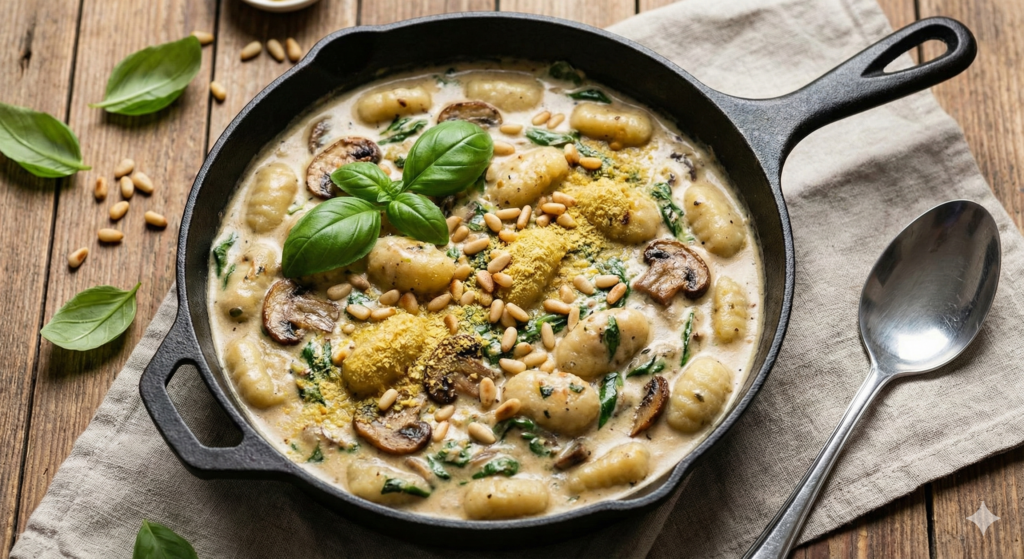 A comforting, one-pan creamy vegan gnocchi skillet packed with flavor, fresh veggies, and a rich dairy-free sauce. Ready in under 30 minutes, perfect for cozy weeknight dinners.