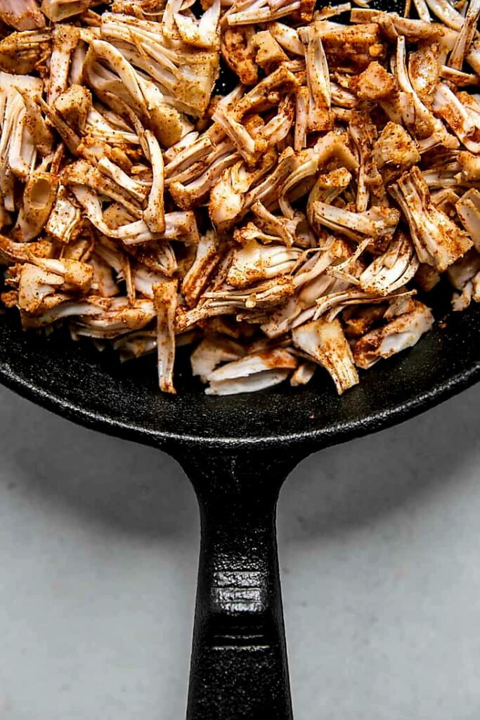 • Sauté for 10–12 minutes, breaking the jackfruit into shreds.